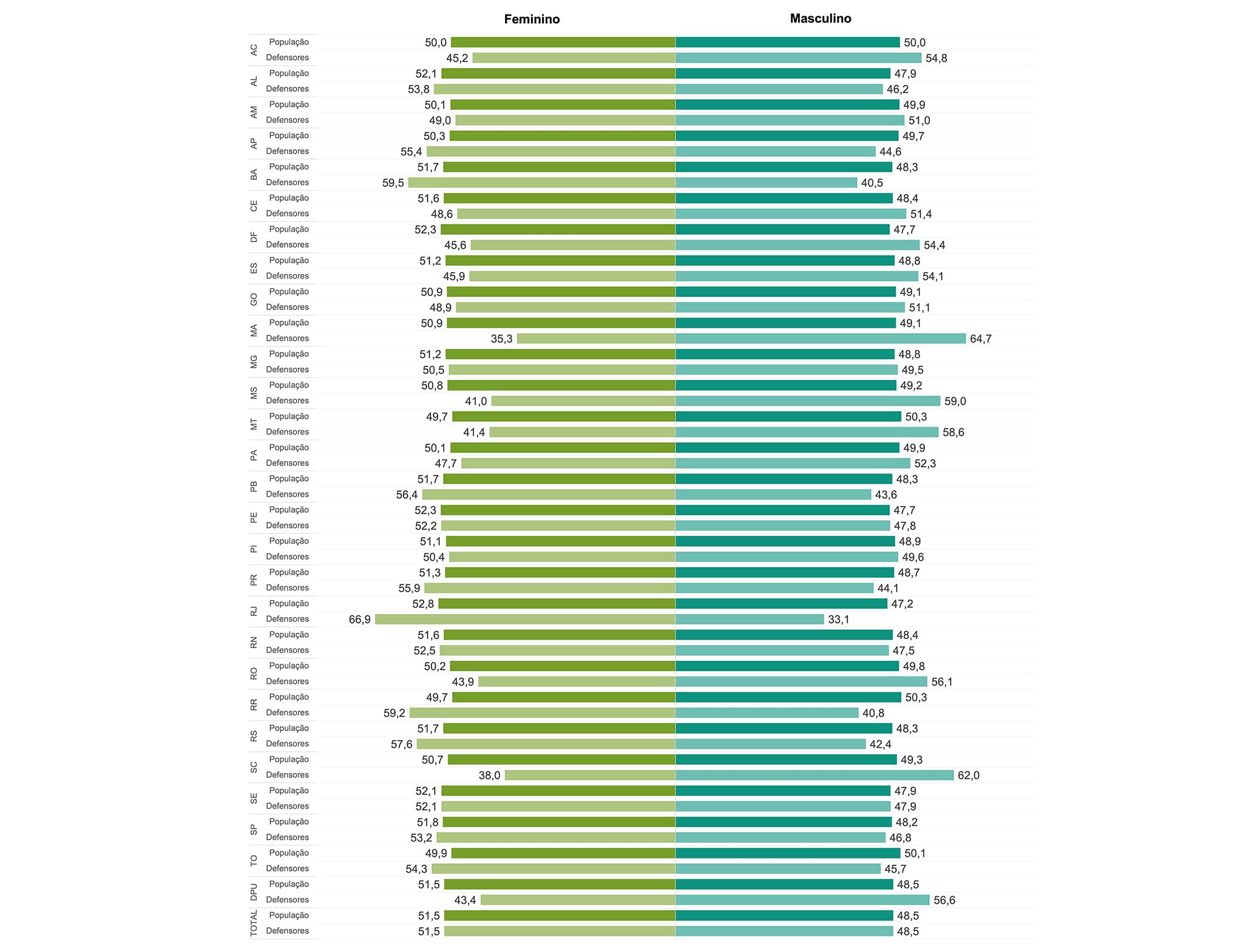 ANÁLISE COMPARATIVA ENTRE O GÊNERO DOS(AS) DEFENSORES(AS) PÚBLICOS(AS) E DA POPULAÇÃO POR UNIDADE FEDERATIVA