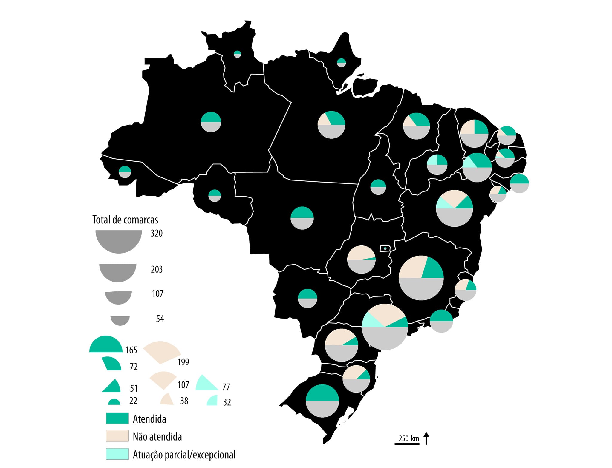 O mapa a seguir indica número de comarcas e a cobertura de atendimento das Defensorias Públicas dos Estados e Distrito Federal, permitindo que seja mais facilmente estimada, em quantidades proporcionais aos semicírculos, o número de comarcas por unidade federativa, bem como o grau de cobertura de atendimento. Pela análise do mapa é possível perceber que em apenas 12 unidades federativas a cobertura de atendimento da Defensoria Pública abrange plenamente todas as comarcas (Acre, Alagoas, Amapá, Amazonas, Distrito Federal, Mato Grosso, Mato Grosso do Sul, Rio de Janeiro, Rio Grande do Sul, Rondônia, Roraima e Tocantins).