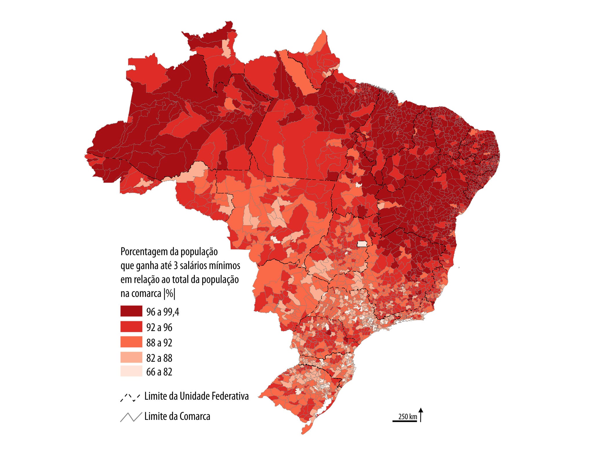Tendo em vista que o IBGE ainda não divulgou os dados socioeconômicos coletados pelo Censo Demográfico 2022, a Pesquisa Nacional da Defensoria Pública utilizou a proporção de habitantes maiores de 10 anos de idade e que possuem renda de até três salários mínimos encontrada no Censo Demográfico 2010, promovendo, em seguida, sua atualização proporcional com base nos dados populacionais já divulgados pelo IBGE relativos ao Censo Demográfico 2022. Com isso, a pesquisa calculou a porcentagem da população que ganha até três salários mínimos por comarca (2025).