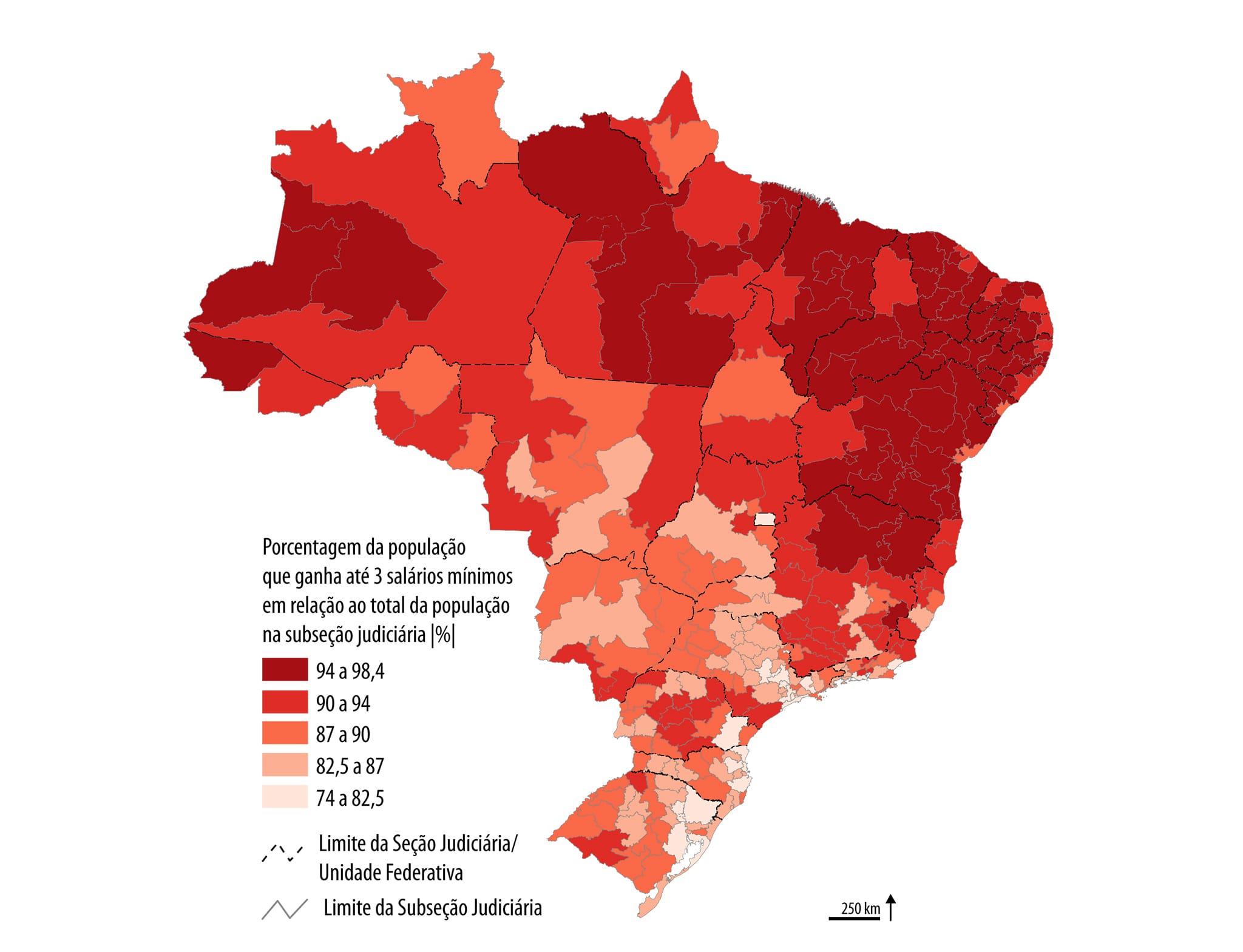 Do mesmo modo, como o IBGE ainda não divulgou os dados socioeconômicos coletados pelo Censo Demográfico 2022, a Pesquisa Nacional da Defensoria Pública promoveu a atualização da proporção de habitantes maiores de 10 anos de idade e que possuem renda de até três salários mínimos encontrada no Censo Demográfico 2010, com base nos dados populacionais já divulgados pelo IBGE relativos ao Censo Demográfico 2022. Com isso, a pesquisa conseguiu calcular a porcentagem da população que ganha até três salários mínimos por seção e subseção judiciária federal (2025).
