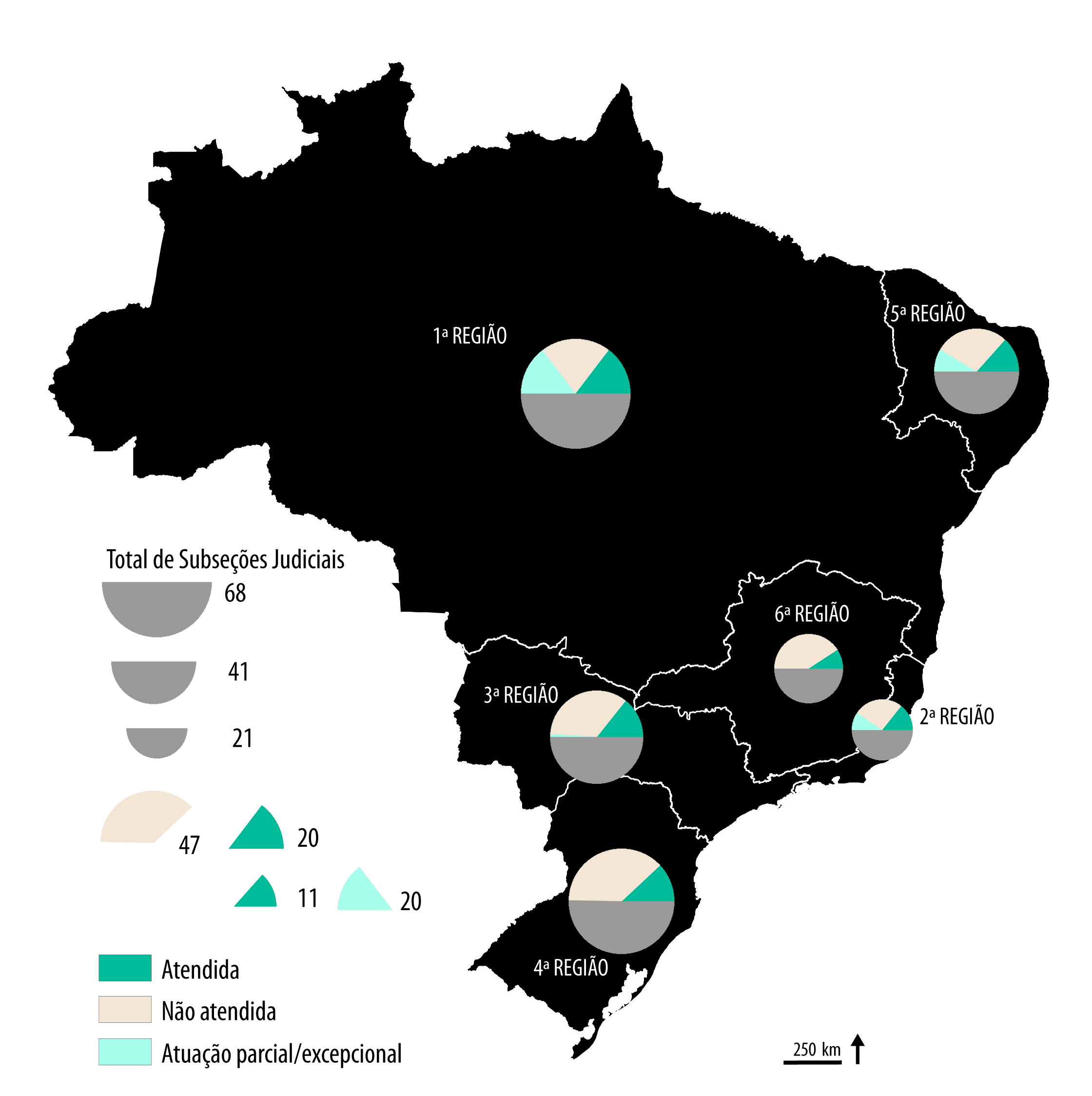 O mapa a seguir indica a número de subseções judiciárias federais e a cobertura de atendimento da Defensoria Pública da União, permitindo que seja mais facilmente estimada, em quantidades proporcionais aos semi-círculos, o número de subseções judiciárias e o grau cobertura territorial da DPU, na escala das regiões da Justiça Federal. A análise do mapa revela que todas as regiões federais possuem reduzido percentual de cobertura, com sensível margem de variação..