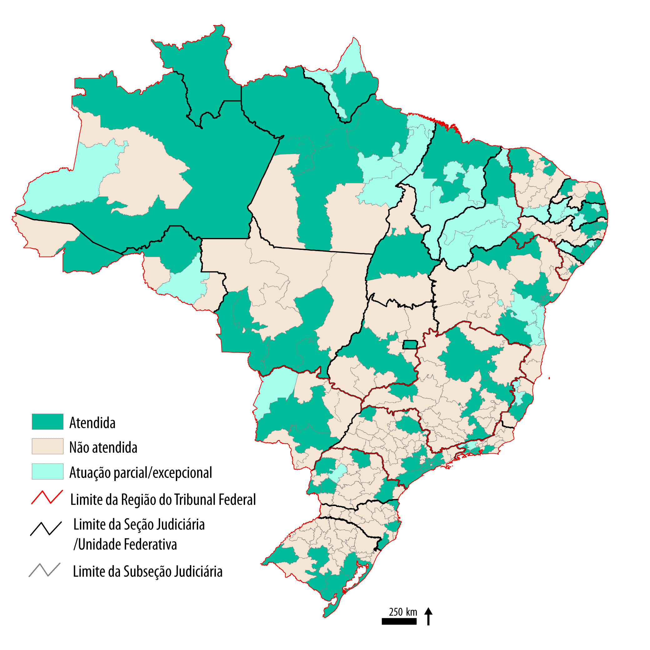 Em virtude do insuficiente quantitativo de Defensores(as) Públicos(as) Federais, apenas 78 subseções judiciárias