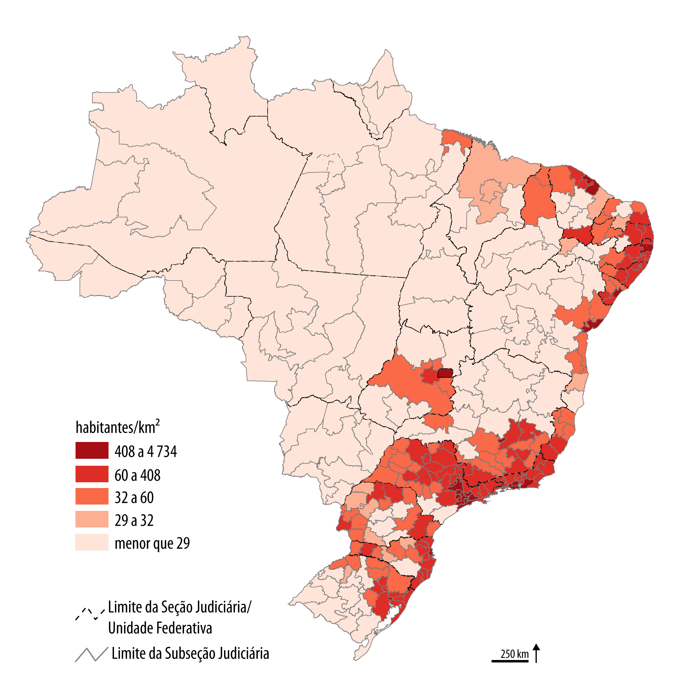 Fonte: Defensoria Pública da União | Pesquisa Nacional da Defensoria Pública (2024). Dados sobre a base geográfica de jurisdição das seções e subseções judiciárias federais obtidos junto aos Tribunais Regionais Federais. Densidade demográfica por seção e subseção judiciária federal calculada com base no Censo Demográfico IBGE (2022). Informações atualizadas até 10/06/2024. Cartografia: Eduardo Dutenkefer.