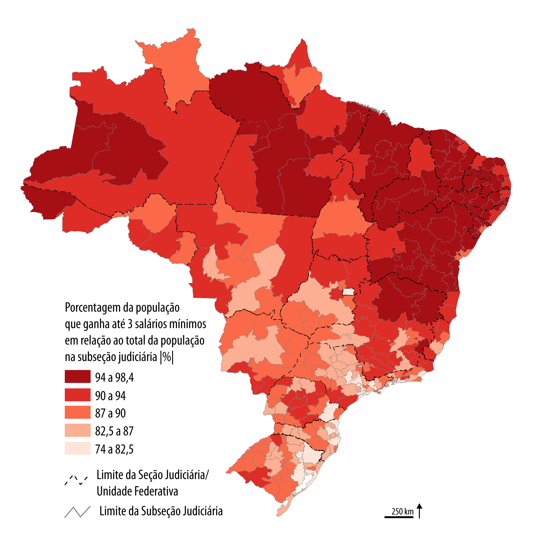 Porcentagem da população com renda de até três salários mínimos por subseção judiciária federal