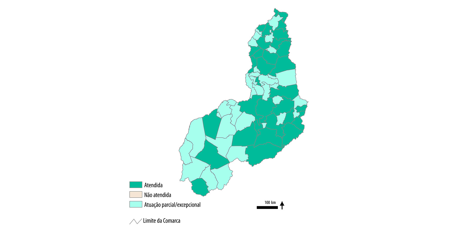 Atualmente, o Estado do Piauí possui 63 comarcas regularmente instaladas. Em virtude do insuficiente quantitativo de Defensores(as) Públicos(as), atualmente apenas 49,2% das comarcas são regularmente atendidas pela DPE-PI. Em virtude do esforço institucional para garantir o acesso à justiça para todos, nas comarcas remanescentes onde a DPE-PI não está regularmente instalada (50,8%), o atendimento jurídico-assistencial é prestado à população vulnerável de forma excepcional por intermédio do projeto “Defensoria Itinerante”, que atua nas causas criminais, causas cíveis lato sensu de natureza consensual e nos procedimentos relativos a registros públicos de pessoas naturais. Outrossim, as referidas comarcas são também contempladas por ações estratégicas periodicamente levadas a efeito pela DPE-PI.